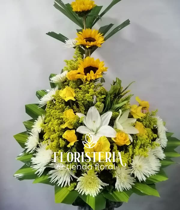 arreglo floral funebre , elaborado con girasoles de altura crisantemos , rosas . (los colores pueden variar .